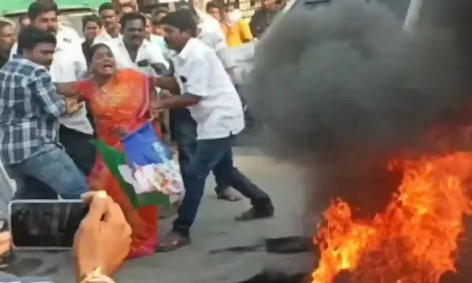 మాచర్ల నియోజకవర్గ మహిళానేత సంపూర్ణమ్మ ఆత్మహత్యాయత్నం చేయడంతో టెన్షన్ వాతావరణం నెలకొంది. మంటల్లో దూకి ఆత్మహత్యకు యత్నించిన సంపూర్ణమ్మను తోటి కార్యకర్తలు అడ్డుకున్నారు. ఈ క్రమంలో మాజీ మున్సిపల్ ఛైర్మన్కు మంటలు అంటుకున్నాయి. వెంటనే అప్రమత్తమైన కార్యకర్తలు అతని చొక్కా విప్పేసి మంటలు ఆర్పడంతో ప్రమాదం తప్పింది.
