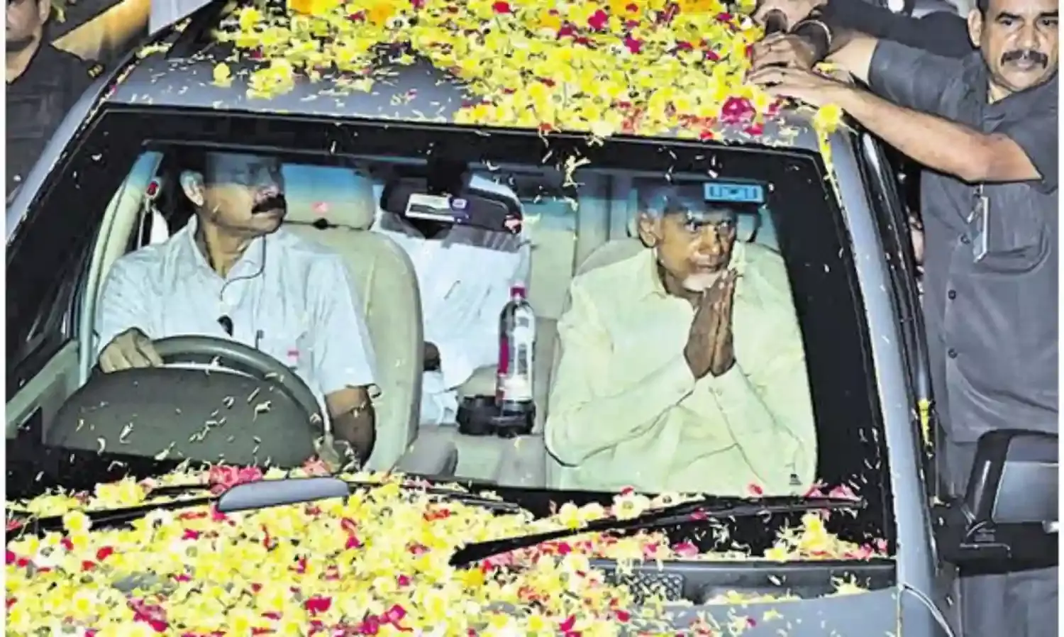 బేగంపేట విమానాశ్రయం రన్వేపై ల్యాండ్ అయిన వెంటనే బయట ఉన్న తెదేపాశ్రేణులు, అభిమానులు పెద్దపెట్టున నినాదాలు చేశారు. ‘మేము సైతం బాబు కోసం’, ‘జై సీబీఎన్’ అంటూ విమానాశ్రయ పరిసరాలను హోరెత్తించారు. తనకోసం వచ్చిన అభిమానులు, పార్టీ శ్రేణులకు కారు లోపల నుంచే చంద్రబాబు అభివాదం చేశారు. బాబు వెంట ఆయన సతీమణి నారా భువనేశ్వరి, మధుసూదన్రావు, రాజగోపాల్ తదితరులు ఉన్నారు. నత్నగర్ నియోజకవర్గంలోని జెక్కాలనీ, సుందర్నగర్, మోడల్కాలనీల నుంచి వచ్చిన పలువురు చంద్రబాబునాయుడు అభిమానులు, కాలనీల ప్రతినిధులు సురేష్ చౌదరి, మాచారావు, జి.పి.రావు తదితరుల ఆధ్వర్యంలో మహిళలు, యువకులు పెద్ద సంఖ్యలో అనుసరించారు.వాహన శ్రేణిపై అడుగడుగునా పూల వర్షం కురిపించారు.