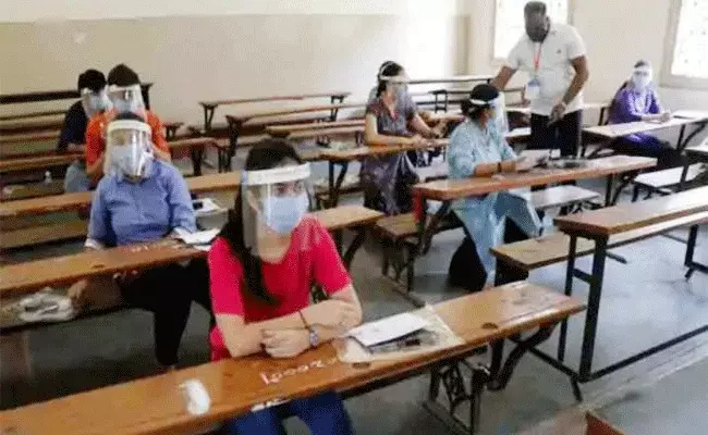 హాల్లో భౌతిక దూరం పాటించేలా ప్రతి విద్యార్థికీ మధ్య ఆరడుగల దూరం ఉంటుంది.