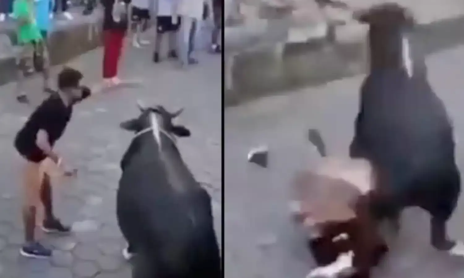 స్పెయిన్కు చెందిన ఓ వ్యక్తి ఎద్దుతో పరాచకాలు ఆడబోయాడు.. నడిరోడ్డు మీద అందరూ చూస్తుండగా తల మీద చేయి వేసి ఏదో చెప్పబోయాడు. దీంతో ఎద్దు ఒక్క ఉదుటున అతడిని తన కొమ్ములతో కుమ్మేసింది. కిందపడిన అతడిని చుట్టుపక్కల వారు వచ్చి రక్షించారు. ఎద్దు.. ఇలాంటి వెధవ్వేషాలు నా దగ్గర పనికిరావన్నట్లు ఎంచక్కా అక్కడి నుంచి వెళ్లిపోయింది.