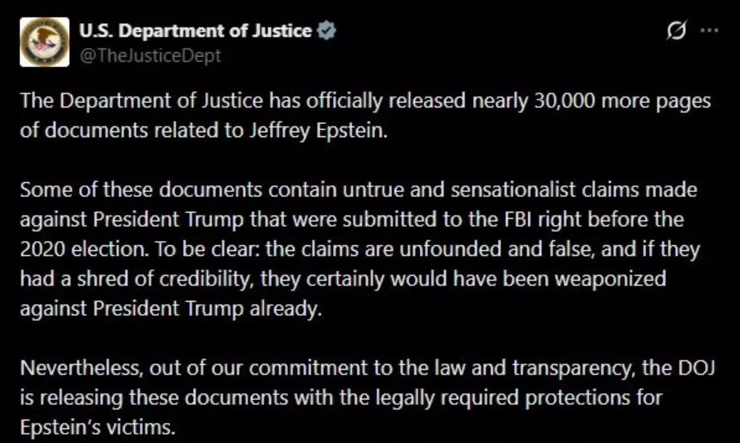'ట్రంప్పై ఉన్న ఆరోపణలు నిరాధారమైనవి. అవి నిజమై ఉంటే ఇప్పటికే ఆయనపై ఆయుధాల్లా వాడేవారు. 2020 అధ్యక్ష ఎన్నికలకు ముందే ఈ ఆరోపణలను ఎఫ్బీఐకి అందజేశాం. అయినప్పటికీ వాటికి ఎలాంటి విశ్వసనీయత లేదు. ఎప్స్టీన్ బాధితుల గోప్యతను కాపాడే నిబంధనలతోనే ఈ పత్రాను విడుదల చేస్తోంది. ఇక డాక్టర్ లారీ నాసర్కు పంపినట్లు చెబుతున్న ఎప్స్టీన్ లేఖ పూర్తిగా నకిలీ అని ఫెడరల్ బ్యూరో ఆఫ్ ఇన్వెస్టిగేషన్ (ఎఫ్బీఐ) తేల్చింది. లేఖలోని రాత ఎప్స్టీన్ హస్తాక్షరాలతో సరిపోలేదు. ఎప్స్టీన్ మృతి చెందిన మూడు రోజుల తర్వాతే లేఖకు పోస్టుముద్ర ఉంది. లేఖపై ఉన్న రిటర్న్ అడ్రస్లో ఎప్స్టీన్ జైలులో ఉన్న వివరాలు, ఖైదీ నంబర్ లేవు. ఇవి రిటర్న్ చేయడానికి తప్పనిసరి. ఈ కారణాలతోనే ఆ లేఖను అప్పట్లోనే అనుమానాస్పదంగా గుర్తించి ఎఫ్బీఐకు పంపింది. చట్టం, పారదర్శకత పట్ల మా నిబద్ధత కారణంగానే ఈ పత్రాలను విడుదల చేస్తున్నాం' అని న్యాయశాఖ ఎక్స్పోస్ట్లో రాసుకొచ్చింది.