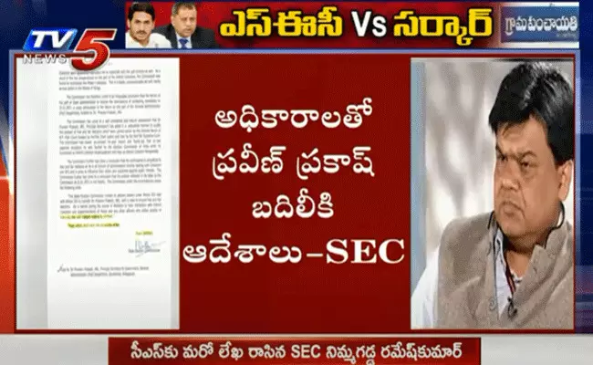 ఏపీ ప్రభుత్వానికి, ఎస్ఈసీకి మధ్య లేఖల యుద్ధం కొనసాగుతోంది. తాజాగా.. సీఎస్కు..ఎస్ఈసీ నిమ్మగడ్డ రమేష్ కుమార్ లేఖ రాశారు. జీఏడీ పొలిటికల్ సెక్రటరీ ప్రవీణ్ ప్రకాష్ను ఎన్నికల విధులనుంచి తొలగించాలని ఆదేశించారు. అంతే కాకుండా ఆయన్ను బదిలీ చేయాలని ఆదేశించారు. ఈ నెల 23న కలెక్టర్ల వీడియో కాన్ఫరెన్స్ జరగకపోవడానికి ప్రవీణ్ ప్రకాష్ బాధ్యుడని, కలెక్టర్లకు, ఎస్పీలకు ఎస్ఈసీ సమావేశాలకు హాజరు కావద్దని ప్రవీణ్ ప్రకాష్ సూచనలు చేశారని ఈ లేఖలో తెలిపారు నిమ్మగడ్డ రమేష్ కుమార్.