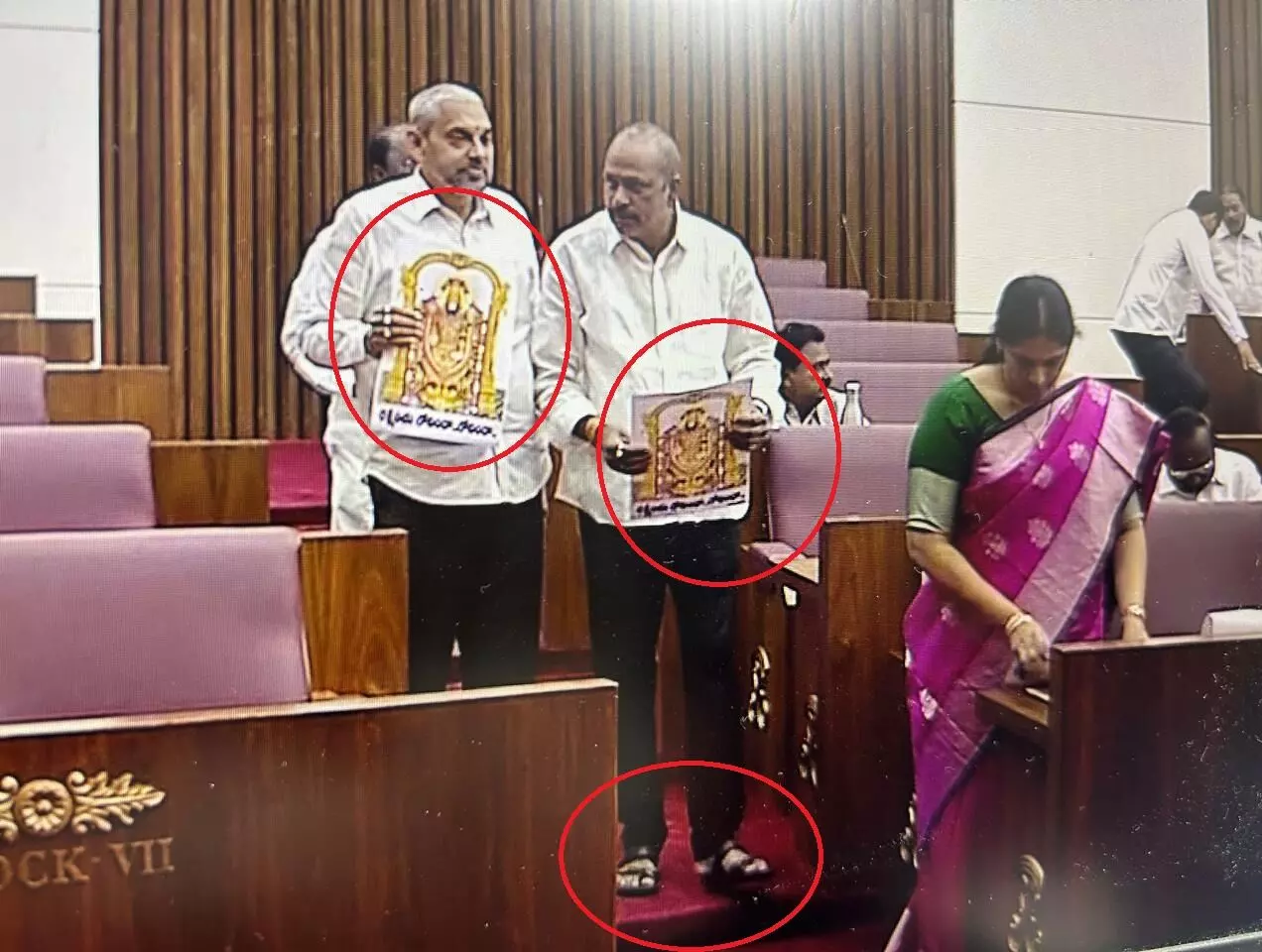 హిందువులు కలియుగ దైవంగా భావించే శ్రీ వెంకటేశ్వర స్వామి ఫొటోలను చెప్పులు, షూలు వేసుకుని శాసన మండలిలో ప్రదర్శించడం వివాదాస్పదంగా మారింది. వైసీపీ మండలి సభ్యులు ఈ విధంగా వ్యవహరించడం హిందువుల మనోభావాలను దెబ్బతీసిందని పలువురు అభిప్రాయపడుతున్నారు. హిందువులు కలియుగ దైవంగా ఆరాధించే శ్రీ వెంకటేశ్వర స్వామి వారి చిత్రపటాలతో మండలిలో జరిగిన ఘటనపై తీవ్ర విమర్శలు వ్యక్తమవుతున్నాయి. స్వామివారి చిత్రాలను చేతబట్టి చెప్పులు, షూలతోనే మండలిలో ప్రదర్శించడంపై ఆధ్యాత్మిక వర్గాలు ఆగ్రహం వ్యక్తం చేశాయి. హిందూ సంప్రదాయాల ప్రకారం దేవతా చిత్రాలను అత్యంత భక్తి, గౌరవాలతో చూడాల్సి ఉండగా, వాటిని ఈ విధంగా ప్రదర్శించడం అనుచితమని విమర్శలు వెల్లువెత్తుతున్నాయి. పవిత్రమైన వేదికగా భావించే శాసన మండలిలో ఇలాంటి ఘటన జరగడం బాధాకరమని పలువురు పేర్కొన్నారు. సంబంధిత సభ్యులపై చర్యలు తీసుకోవాలనే డిమాండ్లు వినిపిస్తున్నాయి. ప్రజల ఆధ్యాత్మిక విశ్వాసాలను గౌరవించడం ప్రతి ప్రజాప్రతినిధి బాధ్యత అని అభిప్రాయాలు వ్యక్తమవుతున్నాయి.