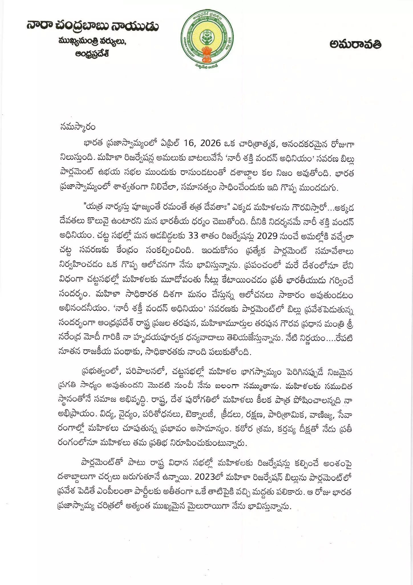 రాజకీయ పార్టీల అధ్యక్షులు, రాష్ట్రంలోని రాజ్యసభ, లోక్సభ ఎంపీలకు సీఎం చంద్రబాబు లేఖ రాశారు. మహిళా రిజర్వేషన్ బిల్లు ‘నారీ శక్తి వందన్’కు పార్లమెంట్లో మద్దతు తెలపాలని లేఖలో కోరారు. జనసేన అధ్యక్షడు పవన్ కల్యాణ్, భాజపా రాష్ట్ర అధ్యక్షుడు మాధవ్, వైకాపా అధ్యక్షుడు జగన్, ఏపీసీసీ అధ్యక్షురాలు షర్మిల, సీపీఎం, సీపీఐ రాష్ట్ర కార్యదర్శులకు సీఎం లేఖలు రాశారు. ‘‘మహిళలకు మూడో వంతు రిజర్వేషన్లు కల్పించాలనే ప్రధాని సంకల్పాన్ని బలపరుద్దాం. బిల్లు ప్రవేశపెట్టే ఈ నెల 16వ తేదీ భారత ప్రజాస్వామ్యంలో చారిత్రక ఘట్టం. నారీ శక్తి వందన్ అధినియం మహిళా సాధికారతకు, దేశ ఉన్నతికి దోహదపడుతుంది. ప్రభుత్వం, పరిపాలన, చట్టసభల్లో మహిళల భాగస్వామ్యం పెరగాలి. అప్పుడే నిజమైన ప్రగతి సాధ్యం’’ అని సీఎం పేర్కొన్నారు.