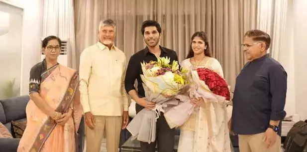 టాలీవుడ్ ప్రముఖ నిర్మాత అల్లు అరవింద్ కుటుంబంలో ఇటీవల జరిగిన వివాహ వేడుకకు సంబంధించిన ఆనందం ఇంకా కొనసాగుతూనే ఉంది. అల్లు కుటుంబానికి చెందిన యువ హీరో అల్లు శిరీష్ వివాహం నయనికతో ఘనంగా జరగగా, ఆ సందర్భంగా పలువురు ప్రముఖులు నూతన దంపతులను ఆశీర్వదించారు. ఈ నేపథ్యంలో ఆంధ్రప్రదేశ్ ముఖ్యమంత్రి నారా చంద్రబాబు నాయుడు స్వయంగా అల్లు అరవింద్ నివాసానికి వెళ్లి నూతన దంపతులను కలవడం విశేషంగా నిలిచింది. అల్లు శిరీష్ – నయనికల వివాహానంతరం వారిని ప్రత్యేకంగా అభినందించేందుకు చంద్రబాబు నాయుడు అల్లు అరవింద్ ఇంటికి వెళ్లారు. ఈ సందర్భంగా నూతన దంపతులను కలిసిన ఆయన వారికి హృదయపూర్వక శుభాకాంక్షలు తెలియజేశారు. వారి దాంపత్య జీవితం సుఖసంతోషాలతో నిండి, నిండు నూరేళ్లు ఆనందంగా కొనసాగాలని ఆశీర్వదించారు. ముఖ్యమంత్రి స్వయంగా ఇంటికి వచ్చి ఆశీర్వదించడం కుటుంబ సభ్యులకు ఆనందాన్ని కలిగించింది.