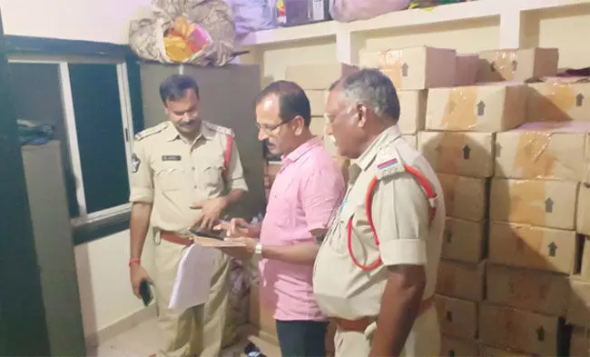 జనసేన అధినేత పవన్కల్యాణ్ పోటీ చేస్తున్న కాకినాడ జిల్లా పిఠాపురంలో సుమారు 80 లక్షల రూపాయల విలువైన మద్యాన్ని... సెబ్, పోలీసు అధికారులు సంయుక్తంగా దాడిచేసి స్వాధీనం చేసుకున్నారు. కళ్లు బైర్లు కమ్మే రీతిలో నిల్వ ఉన్న మద్యం బాక్సులను చూసి అధికారులు నివ్వెరబోయారు. పిఠాపురంలో పవన్ కల్యాణ్ను ఎలాగైనా ఓడించేందుకు... వైకాపా ఏ స్థాయిలో మద్యాన్ని ఇక్కడికి దింపుతోందో చెప్పేందుకు... తాజా ఉదంతమే నిదర్శనం. పిఠాపురం పట్టణంతోపాటు మండలంలో అక్రమ మద్యం నిల్వలు ఉన్నట్లు సమాచారం అందుకున్న సెబ్ అధికారులు, పోలీసులు ఏకకాలంలో దాడులు నిర్వహించారు. జగ్గయ్య చెరువుకు చెందిన వట్టూరి సతీష్ కుమార్ ఇంట్లో 250 బాక్సులు, సాలిపేటలోని అంబటి వీర వెంకట సత్యనారాయణ మూర్తి వద్ద 260, Y.S.R. గార్డెన్స్ కాలనీలోని ఓ ఇంట్లో 290 బాక్సులు, కుమారపురంలోని వేమగిర సువార్తమ్మ నివాసంలో 215 బార్సులు మొత్తం 10 వందల 15 బాక్సులు గుర్తించారు. ఒక్కో బాక్సులో 48 చొప్పున మొత్తంగా 48 వేల 720 మద్యం సీసాలు... ఒక్కొక్కటి 250 మిల్లీ లీటర్లు ఉన్నట్లు అధికారులు గుర్తించారు.