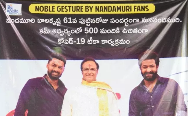 నందమూరి బాలకృష్ణ 61వ జన్మదిన వేడుకలను యిన్నమూరి గోపీచంద్ ఫ్రెండ్స్ సర్కిల్ ఆధ్వర్యంలో ఘనంగా నిర్వహించారు. హీరోగానే కాక, ఎమ్మెల్యేగానూ ఎన్నో సామాజిక సేవా కార్యక్రమాలు చేస్తోన్న బాలయ్య నుంచి స్ఫూర్తి పొంది అభిమానులు కూడా అదే తరహాలో ఆయన బర్త్ డే వేడుకలను నిర్వహించారు. ఇందుకోసం హైదరాబాద్ కూకట్పల్లిలోని భ్రమరాంబ థియేటర్ ఆవరణలో 500మంది నిరుపేదలకు ఉచితంగా కోవిడ్ వ్యాక్సిన్ ను అందించారు. బాలయ్య వీరాభిమాని అయిన యిన్నమూరి గోపీచంద్ ఫ్రెండ్ సర్కిల్ ఈ కార్యక్రమాన్ని మంచి సేవాతత్పరతతో నిర్వహించి శెభాష్ అనిపించుకుంది.