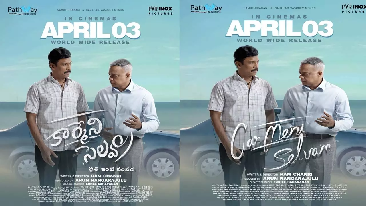పాత్వే ప్రొడక్షన్స్ బ్యానర్పై అరుణ్ రంగరాజులు నిర్మాతగా రామ్ చక్రి దర్శకత్వంలో తెలుగు, తమిళ భాషల్లో రూపొందుతున్న ద్విభాషా చిత్రం ‘కార్మేని సెల్వం’. విలక్షణ నటులు సముద్రఖని ప్రధాన పాత్ర పోషిస్తున్న ఈ చిత్రంలో గౌతమ్ వాసుదేవ్ మీనన్ కీలక పాత్రలో కనిపించనున్నారు. లక్ష్మీ ప్రియా, అభినయ, కార్తిక్ కుమార్, బడవ గోపీ, కోతండం, కరణ్ చక్రవర్తి, శంకర నారాయణ్ వి, హరిత పరాకోడ్ ఇతర పాత్రలు పోషిస్తున్నారు. ఈ చిత్రాన్ని ఏప్రిల్ 3న తెలుగు, తమిళ భాషల్లో గ్రాండ్ థియేట్రికల్ రిలీజ్ చేయనున్నట్టు గురువారం ప్రకటించారు. ప్రముఖ డిస్ట్రిబ్యూషన్ సంస్థ పీవీఆర్ ఐనాక్స్ పిక్చర్స్ ఈ చిత్రానికి అధికారిక థియేట్రికల్ డిస్ట్రిబ్యూషన్ పార్ట్నర్గా చేరింది. దేశవ్యాప్తంగా పీవీఆర్ సంస్థ తమ విస్తరణను మరింత బలపరుచుకుంటున్న నేపథ్యంలో ‘కార్మేని సెల్వం’ సినిమాను భారీ స్థాయిలో విడుదల చేయడానికి సన్నాహాలు చేస్తున్నారు. ఆధునిక కాలానికి అనుసంధానమైన ఈ కథ ఇప్పటికే విడుదలైన ఫస్ట్ లుక్ పోస్టర్తో మంచి ఆసక్తిని రేకెత్తించింది. త్వరలో విడుదల కాబోయే టీజర్తో ప్రేక్షకుల్లో మరింత క్యూరియాసిటీని పెంచాలని మేకర్స్ ప్లాన్ చేస్తున్నారు.