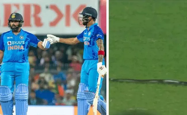 Snake In Match : భారత్, సౌతాఫ్రికా మధ్య గువాహటిలో జరుగుతున్న మ్యాచ్కు చిన్న అంతరాయం ఏర్పడింది. భారత ఓపెనర్లు కేఎల్ రాహుల్, రోహిత్ శర్మ బ్యాటింగ్ చేస్తుండగా గ్రౌండ్లోకి సడన్గా పాము ఎంటర్ అయ్యింది. దీంతో మ్యాచ్ను కాసేపు నిలిపేశారు. మైదానం సిబ్బంది వచ్చి పామును పట్టుకుని తీసుకెళ్లాక మ్యాచ్ తిరిగి ప్రారంభమైంది.
