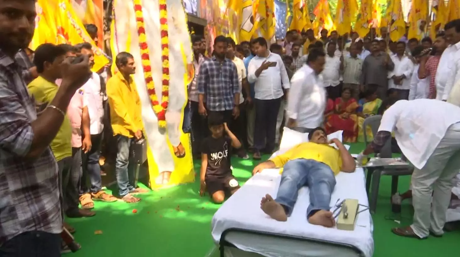ఏపీలోని 175 స్థానాల్లో... విజయవాడ పశ్చిమ సీటు ఒక్కటే పక్కన పెట్టి.... 174 స్థానాల్లో IVRSసర్వే చేపడుతున్నారన్న బుద్దా వెంకన్న.. ఇది తనకు బాధ కలిగించిందని తెలిపారు. రక్తం తీసి చంద్రబాబు చిత్ర పటానికి బుద్దా వెంకన్న కాళ్లు కడిగారు. సీబీఎన్ జిందాబాద్ అంటూ.. రక్తంతో గోడపై రాశారు. తన అభిమానాన్ని చాటుకునేందుకే ఇదంతా చేస్తున్నట్టు బుద్దావెంకన్న తెలిపారు.