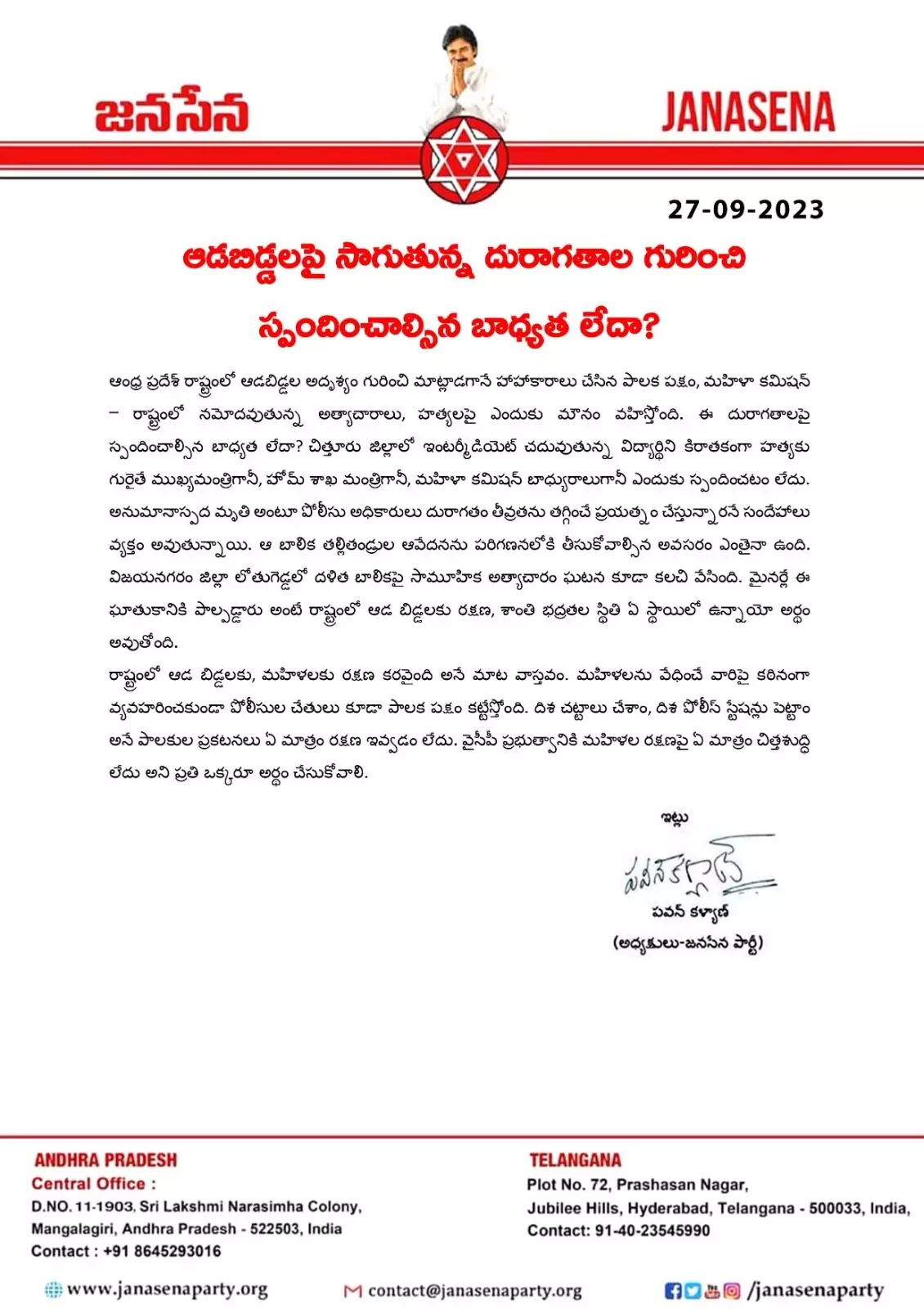 ముఖ్యమంత్రి, హోం మంత్రి, మహిళా కమిషన్కు ఈ దురాగతాలపై స్పందించాల్సిన బాధ్యత లేదా అని పవన్కళ్యాణ్ ప్రశ్నించారు. కేసు తీవ్రతను తగ్గించేందుకు అనుమానాస్పద మృతి అంటూ పోలీసు అధికారులు ప్రయత్నిస్తున్నారని ఆరోపించారు. విజయనగరం జిల్లాలోతుగెడ్డలో దళిత బాలికపై సామూహిక అత్యాచారం ఘటన కూడా... కలచి వేసిందన్నారు. మైనర్లే ఈ ఘాతుకానికి పాల్పడ్డారంటే ఏపీలో శాంతి భద్రతలు ఏ స్థాయిలో ఉన్నాయో అర్థం అవుతోందని పవన్ ఆవేదన వ్యక్తం చేశారు.