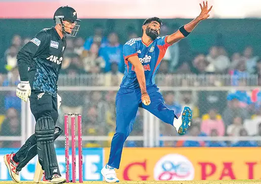 మధ్య ఓవర్లలో కూడా భారత బౌలర్లు ఏ మాత్రం సడలింపు ఇవ్వలేదు. రవి బిష్ణోయ్ తన గూగ్లీలు, ఫ్లిప్పర్లతో బ్యాటర్లను ఇబ్బంది పెట్టాడు. కుల్దీప్ యాదవ్ వేసిన ఓవర్లో చాప్మన్, ఫిలిప్స్ కొన్ని భారీ షాట్లు ఆడడంతో స్కోరు కొంత ఊపందుకున్నా.. కీలక సమయంలో వరుస వికెట్లు పడటంతో న్యూజిలాండ్ భారీ స్కోరు సాధించలేకపోయింది. చివర్లో కెప్టెన్ మిచెల్ శాంట్నర్ పోరాటం చేసినా.. భారత బౌలింగ్ దెబ్బకు కివీస్ 153 పరుగులకే పరిమితమయ్యింది. భారత బౌలింగ్లో జస్ప్రీత్ బుమ్రా 3 వికెట్లు తీసి ‘ప్లేయర్ ఆఫ్ ద మ్యాచ్’గా నిలిచాడు. రవి బిష్ణోయ్, హార్దిక్ పాండ్య తలో రెండు వికెట్లు తీసి కీలక పాత్ర పోషించారు. 153 పరుగుల లక్ష్యంతో బ్యాటింగ్కు దిగిన భారత్ మొదటిసారి చిన్న ఆటుపోటును ఎదుర్కొంది. తొలి బంతికే సంజూ శాంసన్ సున్నాకే వెనుదిరగడం అభిమానులను క్షణకాలం ఆందోళనకు గురిచేసింది. హెన్రీ వేసిన బంతికి క్లీన్బౌల్డ్ అయిన సంజూ.. తన వైఫల్యాల పరంపరను కొనసాగించాడు. అయితే ఆ వెంటనే ఇషాన్ కిషన్ బ్యాట్ ఝుళిపించడంతో ఆ వికెట్ ప్రభావం కనిపించలేదు. ఇషాన్ తొలి ఓవర్లోనే వరుసగా రెండు సిక్స్లు, ఓ ఫోర్ బాది భారత ఇన్నింగ్స్కు వేగం అందించాడు. మరో వైపు అభిషేక్ శర్మ కూడా దూకుడు కొనసాగించాడు. మూడు ఓవర్లు ముగిసే సరికి భారత్ 49 పరుగులు సాధించి మ్యాచ్ను పూర్తిగా తన ఆధీనంలోకి తీసుకుంది. సోధి బౌలింగ్లో ఇషాన్ అవుట్ అయినా.. అభిషేక్ ఆగలేదు. బుధవారం విశాఖపట్నంలో జరగనున్న నాలుగో టీ20 మ్యాచ్పై భారీ అంచనాలు నెలకొన్నాయి.