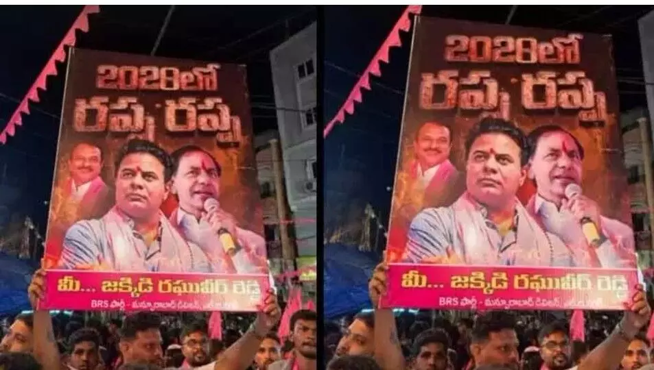 జూబ్లిహిల్స్ ఉపఎన్నిక దగ్గరపడటంతో కాంగ్రెస్, బీఆర్ఎస్ పార్టీలు ప్రచారంలో జోష్ మరింత పెంచాయి. అటు సీఎం రేవంత్తో పాటు మంత్రులు, ఎమ్మెల్యేలు ప్రచారంలో బిజీగా ఉండగా బీఆర్ఎస్ నుండి కేటీఆర్, హరీష్ రావు సహా ఎమ్మెల్యేలు ప్రచారంలో పాల్గొంటున్నారు. అయితే ఈక్రమంలో ఆసక్తికర ఘటన చోటు చేసుకుంది. ఎన్నికల ప్రచారం సందర్భంగా బీఆర్ఎస్ రోడ్ షోలో రప్పా రప్పా 2028 పోస్టర్లు దర్శనం ఇచ్చాయి. పుష్ప సినిమాలోని రప్ప రప్ప డైలాగ్ పోస్టర్ను ఓ వ్యక్తి ప్రదర్శించగా అందులో బీఆర్ఎస్ నేత జక్కిడి రఘువీర్ రెడ్డి పేరు ఉంది. అంతేకాకుండా కేసీఆర్ మరియు కేటీఆర్ ఫోటోలు ఉన్నాయి. అయితే అప్పట్లో వైసీపీ ఇలాంటి పోస్టర్లనే ప్రదర్శించడంతో ఏపీలో దుమారం రేగింది. సినిమాలోని డైలాగులో రప్పా రప్పా నరుకుతాం.. అని ఉంటుంది. దీంతో వైసీపీ ఈ డైలాగును వాడటంతో టీడీపీ విమర్శలు కురిపించింది.