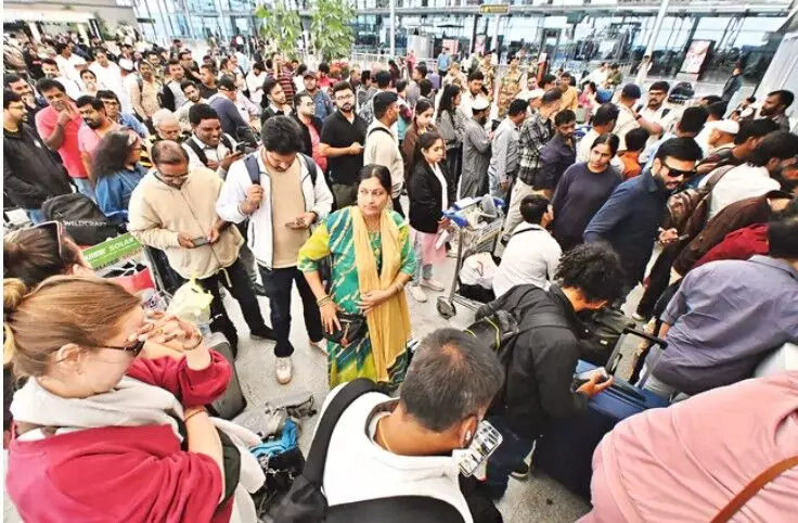 ఇండిగో ఎయిర్లైన్స్ సంస్థ ముందస్తు సమాచారం లేకుండా విమాన సర్వీసుల్ని రద్దు చేయడంతో శంషాబాద్ విమానాశ్రయంలో ప్రయాణికులు ఆగ్రహావేశాలు వ్యక్తం చేశారు. ముందస్తు సమాచారం లేకుండా శుక్రవారం ఒక్కరోజే 155 విమాన సర్వీసులను రద్దు చేయడంతో వేలమంది తీవ్ర ఇబ్బందులు పడ్డారు. ఇందులో శంషాబాద్ నుంచి వెళ్లాల్సినవి 84 ఉండగా.. వేరే ప్రాంతాల నుంచి ఇక్కడకు రావాల్సినవి 71 ఉన్నాయి. తెల్లవారుజాము నుంచే విమానాశ్రయంలో గందరగోళ పరిస్థితులు నెలకొన్నాయి. ఆన్లైన్లో విమాన సర్వీసుల రాకపోకలు యథావిధిగా సాగుతున్నట్లు చూపిస్తుండడం.. విమానాశ్రయంలో పరిస్థితులు అందుకు భిన్నంగా ఉండడంతో ప్రయాణికులు ఆగ్రహోదగ్రులయ్యారు. ధర్నాకు కూడా దిగారు. చెకిన్ పూర్తయ్యాక సర్వీసులను రద్దుచేసినట్లు ప్రకటించడంతో ఎంతో ఆందోళనకు గురయ్యారు. ఇండిగో కౌంటర్ల వద్ద నగదు వెనక్కి తీసుకోవడానికి, రీషెడ్యూల్ చేసుకోవడానికి క్యూలైన్లలో పడిగాపులుపడ్డారు. తగినన్ని కుర్చీలు లేక కొందరు నేలపైనే కూర్చుండిపోయారు. అత్యవసరంగా వెళ్లాల్సినవారు ఇతర విమానయాన సంస్థల నుంచి టికెట్లు కొనేందుకు యత్నించగా... ధరలు ఆకాశాన్నంటాయి. హైదరాబాద్-కోచి విమానం నాలుగో రోజూ రద్దు కావడంతో శబరిమలై వెళ్లే భక్తులు శుక్రవారం తెల్లవారుజామున ఆందోళన చేపట్టారు.