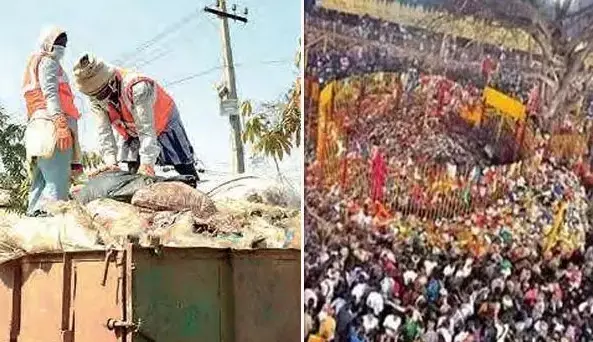 ఆసియాలోనే అతిపెద్ద గిరిజన జాతర, తెలంగాణ కుంభమేళాగా పేరుగాంచిన మేడారం సమ్మక్క-సారలమ్మ మహాజాతర ముగిసింది. లక్షలాది మంది భక్తుల రాకతో నెల రోజులుగా కిక్కిరిసిపోయిన మేడారం పరిసరాలు.. జాతర ముగిసిన అనంతరం భారీగా పేరుకుపోయిన వ్యర్థాలతో నిండిపోయాయి. భక్తులు క్షేమంగా తమ గమ్యస్థానాలకు చేరుకున్నప్పటికీ.. వారు వదిలి వెళ్లిన టన్నుల కొద్దీ చెత్తను శుభ్రం చేయడం ఇప్పుడు అధికారులకు, పారిశుధ్య సిబ్బందికి పెద్ద సవాల్గా మారింది. జంతు, కోళ్ల వ్యర్థాలు కుళ్లిపోవడంతో ఆ ప్రాంతమంతా తీవ్ర దుర్గంధం వెదజల్లుతోంది. పరిస్థితిని అదుపులోకి తీసుకొచ్చేందుకు అధికారులు ప్రత్యేక కార్యాచరణ రూపొందించి, పెద్ద సంఖ్యలో పారిశుద్ధ్య సిబ్బందితో శుభ్రపరిచే పనులను వేగవంతం చేస్తున్నారు. ఈ శుభ్రతా పనుల్లో ఉన్న కార్మికులు తీవ్ర అసహనం వ్యక్తం చేస్తున్నారు. సాధారణ క్లీనింగ్ అని చెప్పి తీసుకొచ్చారని, కానీ జంతు అవశేషాలు, కోళ్ల వ్యర్థాలతో కూడిన అత్యంత దుర్భర పరిస్థితుల్లో పనిచేయాల్సి వస్తోందని వారు వేదన వ్యక్తం చేస్తున్నారు. అమ్మవారి కృపతోనే ఈ పనిని భరిస్తున్నామని చెబుతూ భావోద్వేగానికి లోనవుతున్నారు. వ్యర్థాల్లో దాదాపు 48 శాతం ప్లాస్టిక్, గాజు సీసాల వంటివి ఉండటం ఆందోళన కలిగిస్తోంది. మేడారంతో పాటు కన్నెపల్లి, నార్లాపూర్, కొంగల గట్టు వంటి ప్రాంతాల్లో దాదాపు 3 వేల టన్నుల చెత్త పేరుకుపోయినట్లు అధికారులు అంచనా వేస్తున్నారు.