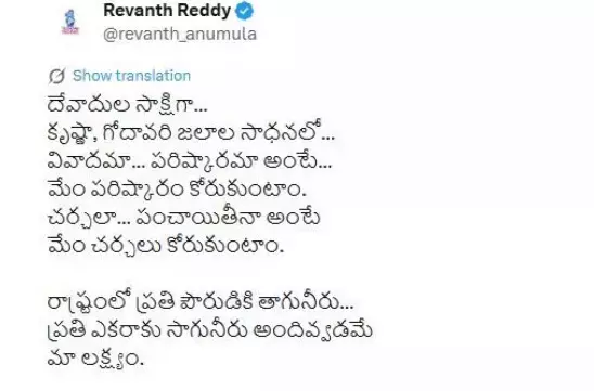 తెలుగు రాష్ట్రాల మధ్య కృష్ణా, గోదావరి నదీ జలాల పంపిణీ అంశం దశాబ్దాలుగా కొనసాగుతున్న కీలక సమస్యగా నిలిచింది. విభజన తర్వాత ఈ వివాదం మరింత ప్రాధాన్యత సంతరించుకుని, ఇరు రాష్ట్రాల అభివృద్ధి ప్రణాళికల్లో ప్రధాన అంశంగా మారింది. జలాల విషయంలో ఘర్షణల కంటే చర్చల ద్వారానే శాశ్వత పరిష్కారం సాధ్యమని నిపుణులు సూచిస్తున్న నేపథ్యంలో, ఈ అంశంపై రాజకీయ ప్రకటనలు కూడా ఆసక్తిని రేకెత్తిస్తున్నాయి. ఈ క్రమంలో ముఖ్యమంత్రి రేవంత్ రెడ్డి సామాజిక మాధ్యమ వేదిక ఎక్స్లో స్పందించారు. దేవాదుల ప్రాజెక్టును సాక్షిగా ఉంచుకుని కృష్ణా, గోదావరి జలాల విషయంలో తమ వైఖరిని స్పష్టం చేశారు. వివాదాలకంటే పరిష్కారమే తమ లక్ష్యమని, పంచాయితీల కంటే చర్చల ద్వారానే ముందుకు సాగాలని తెలిపారు. రాష్ట్రంలోని ప్రతి పౌరుడికి తాగునీరు, ప్రతి ఎకరాకు సాగునీరు అందించడం తమ ప్రభుత్వ ప్రధాన లక్ష్యమని ఆయన ట్వీట్లో పేర్కొన్నారు. జలాల సాధనలో రాజీలేని పోరాటం చేస్తూనే, స్నేహపూర్వక వాతావరణంలో సమస్యలను పరిష్కరించేందుకు కట్టుబడి ఉన్నామని స్పష్టం చేశారు.