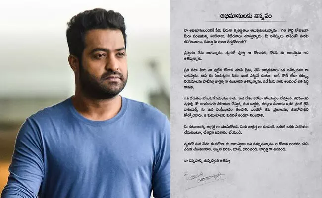 JR NTR: తన అభిమానులకి యంగ్ టైగర్ ఎన్టీఆర్ లేఖ రాశారు. ఈ లేఖలో ఈ ఏడాది తన పుట్టినరోజు నాడు(మే 20) ఏవిధమైన వేడుకలు చేయవద్దని సూచించారు. ఈ మేరకు ట్విట్టర్ వేదికగా ఓ ప్రకటనను విడుదల చేశాడు ఎన్టీఆర్. " అభిమానులకు విన్నపం.. నా అభిమానులందరికీ పేరు పేరునా కృతజ్ఞతలు తెలుపుకుంటున్నాను . గత కొద్ది రోజులుగా మీరు పంపుతున్న సందేశాలు, వీడియోలు చూస్తున్నాను, మీ ఆశీస్సులు నాకెంతో ఊరట కలిగించాయి. ఏమిచ్చి మీ రుణం తీర్చుకోగలను? ప్రస్తుతం నేను బాగున్నాను. త్వరలో పూర్తిగా కోలుకుని, కోవిడ్ ను జయిస్తాను అని ఆశిస్తున్నాను. ప్రతి ఏటా మీరు నా పుట్టిన రోజున చూపే ప్రమ, చేసే కార్యక్రమాలు ఒక ఆశీర్వచనంగా భావిస్తాను.